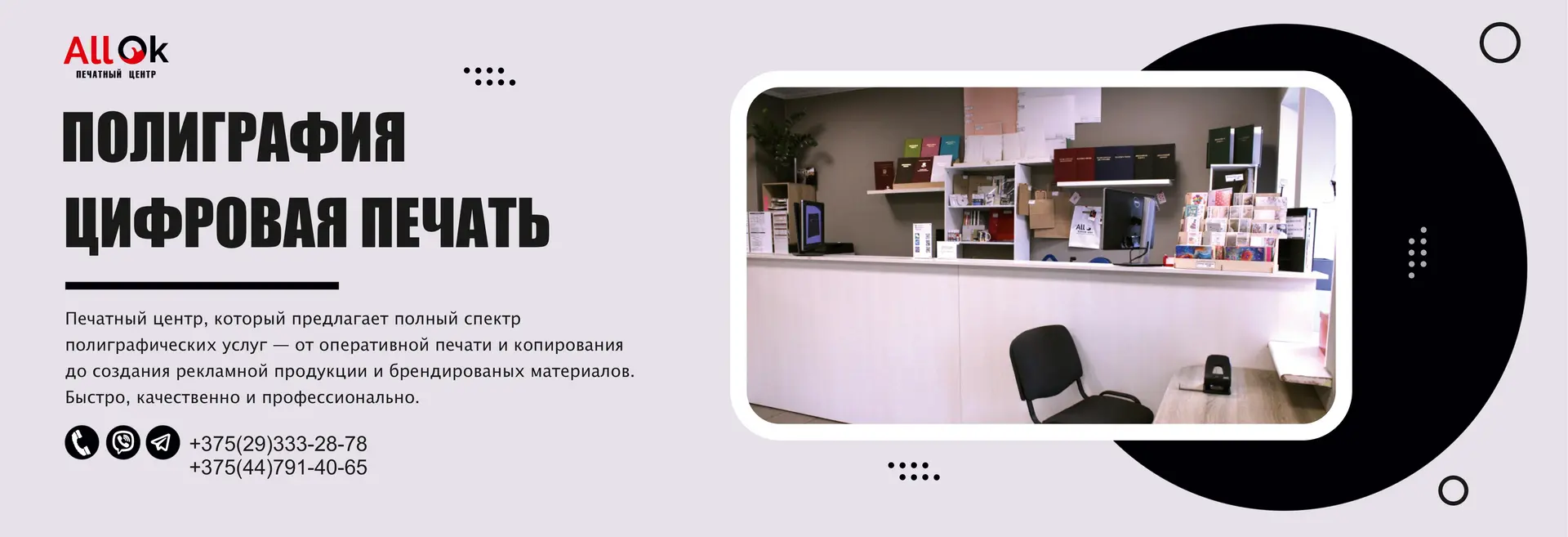 Мы стремимся сделать процесс максимально удобным: от простой распечатки до подготовки материалов для презентаций, учёбы и работы. Вежливый персонал, внимательное отношение к деталям и гибкий подход к каждому заказу — всё это делает Printallok.by надежным местом, куда хочется возвращаться.